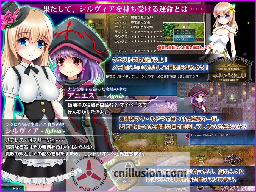 贵族少女シルヴィア(Sylvia)秉持“贵族义务”,离开豪宅成为冒险者,在公会接取任务探索迷宫、对抗怪物。玩法经典RPG:回合战斗、装备强化、任务推进世界观。特色包括衣服更换系统(8套服装+配饰,反映在行走/对话/战斗),以及战败H:衣服渐破、败北非GameOver而是被侵犯/抢劫。50基CG+差分超800张,H场景100+(含触手、群交、卖春、壁尻、催眠、石化等),多分支4结局(各有专属H)。支持New Game+继承、回忆室、难度选择。AI汉化版流畅,V1.0.4修复Bug+存档便利,时长15-20小时,凌辱与冒险并重。