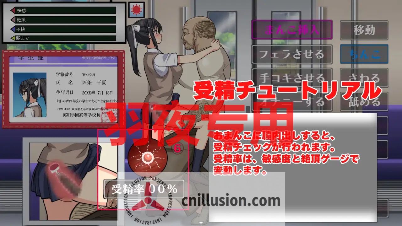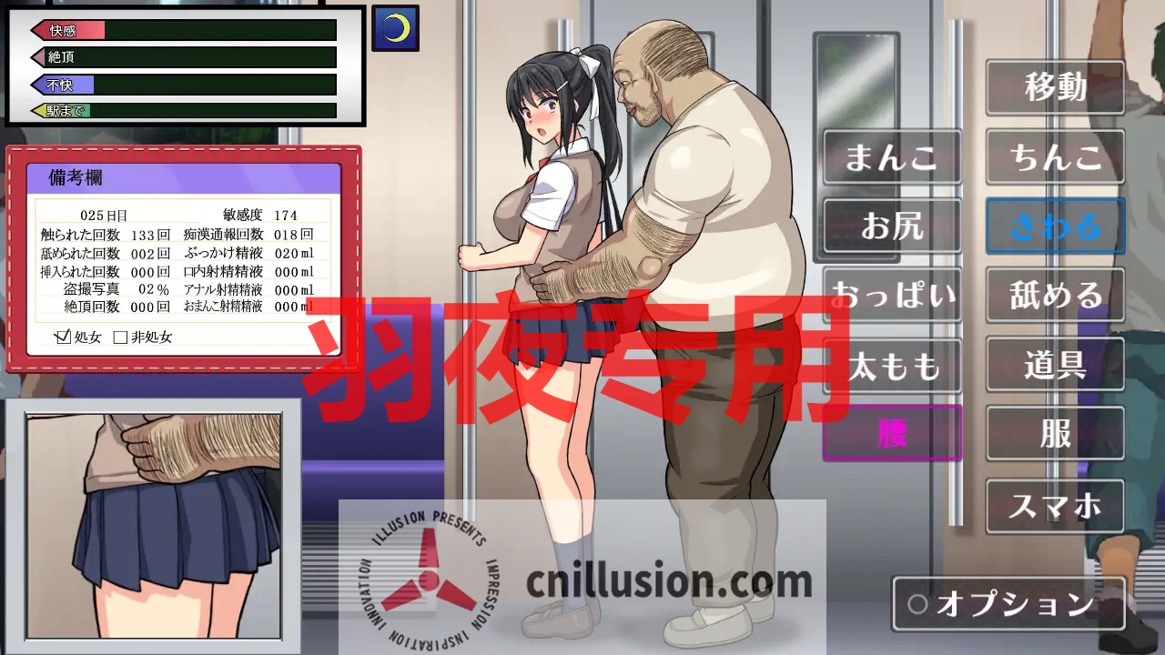 以痴汉为人生乐趣的中年大叔,盯上了性格强势的剑道部马尾JK西条千夏(CV:浅木式),在上学电车内短时间内植入快感并以种付为目标的SLG游戏。没有天数限制,没有游戏结束,轻松游玩。从接近→大腿/腰部触摸提升敏感度(查看学生手册确认),降低不快感后使用跳蛋+揉胸→中年阴茎插入,多轮中出积累绝顶值→妊娠通关。动态H场景流畅,颜射/玩具/内裤偷拍自由。AI智能翻译版Ver6(19日更新)汉化自然,度盘1G,时长1-2小时,反复种付上瘾。