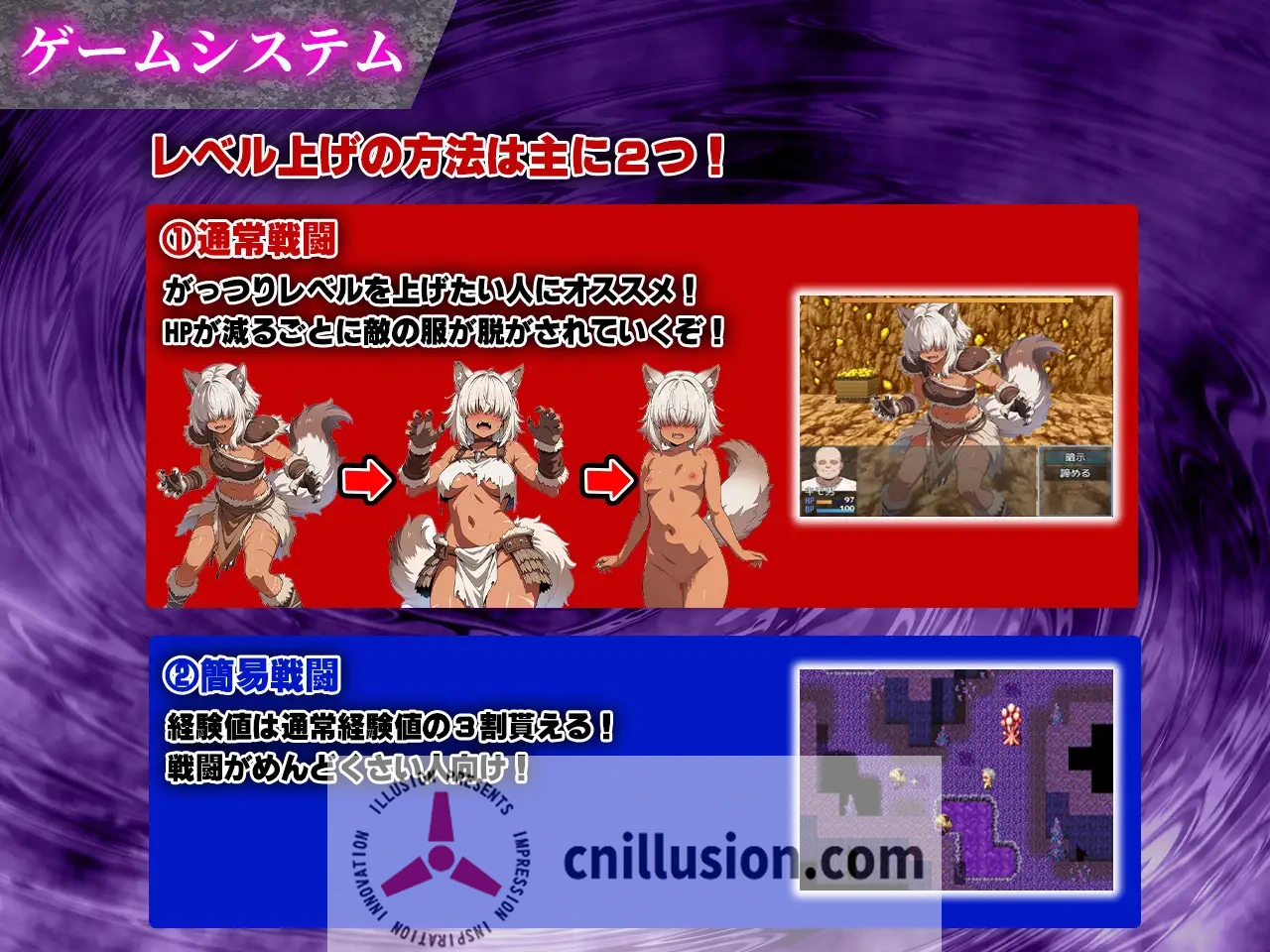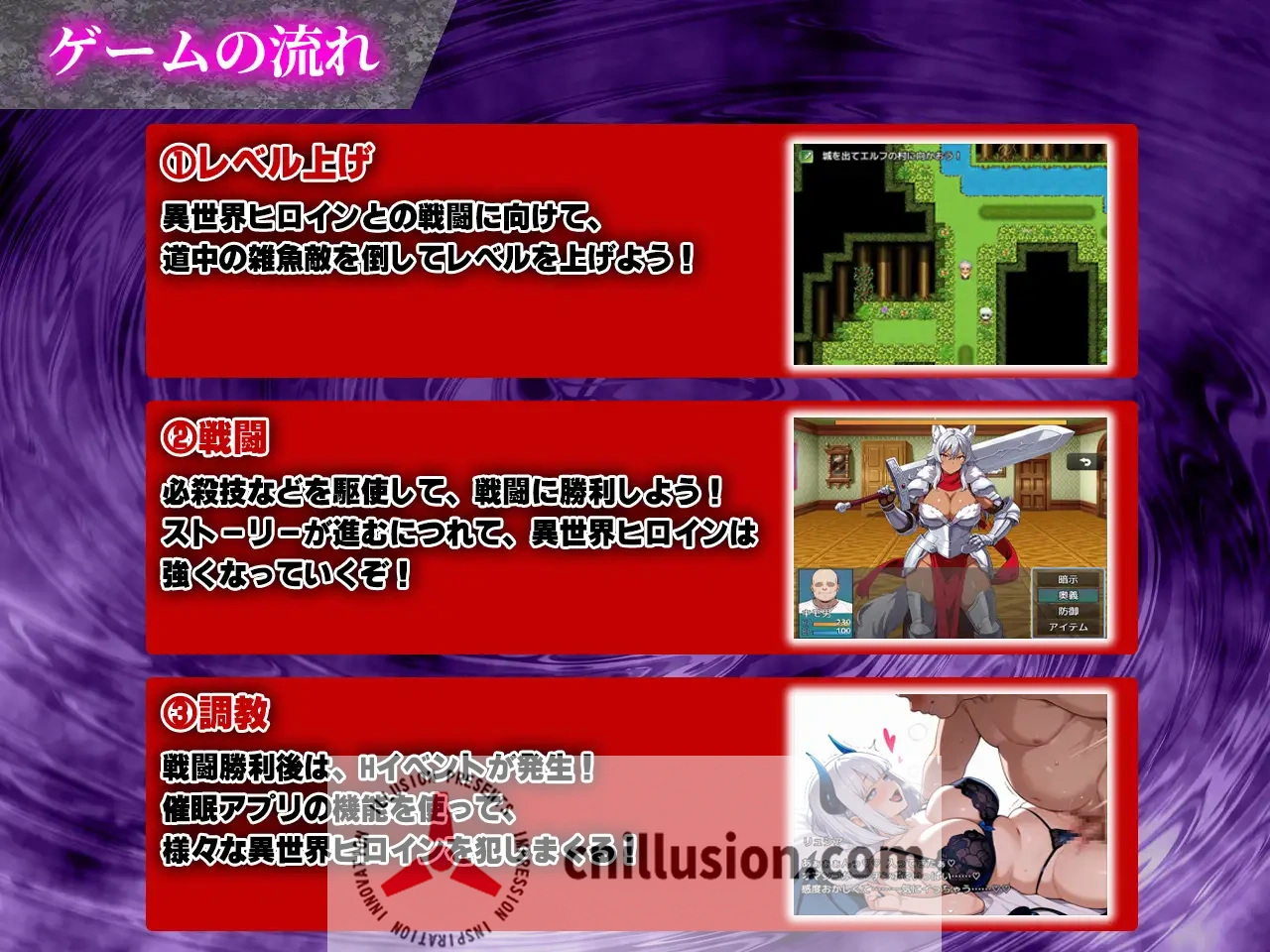 游戏采用RPG框架,包含城镇探索、战斗事件、催眠指令系统、H场景触发。